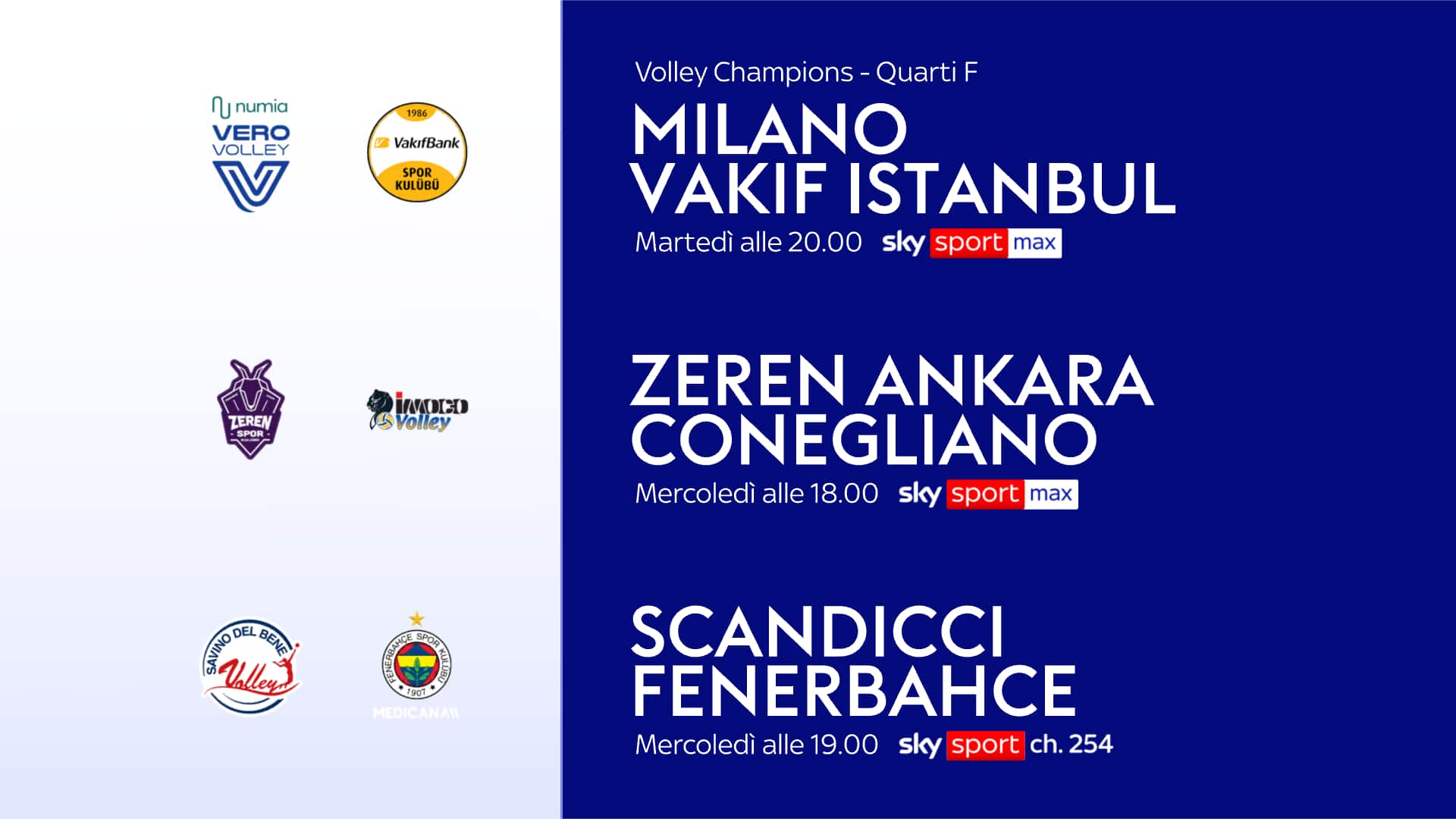 - Alle 20: NUMIA MILANO-VAFIBANK ISTANBUL su Sky Sport Max. Telecronaca di Stefano Locatelli e commento di Rachele Sangiuliano