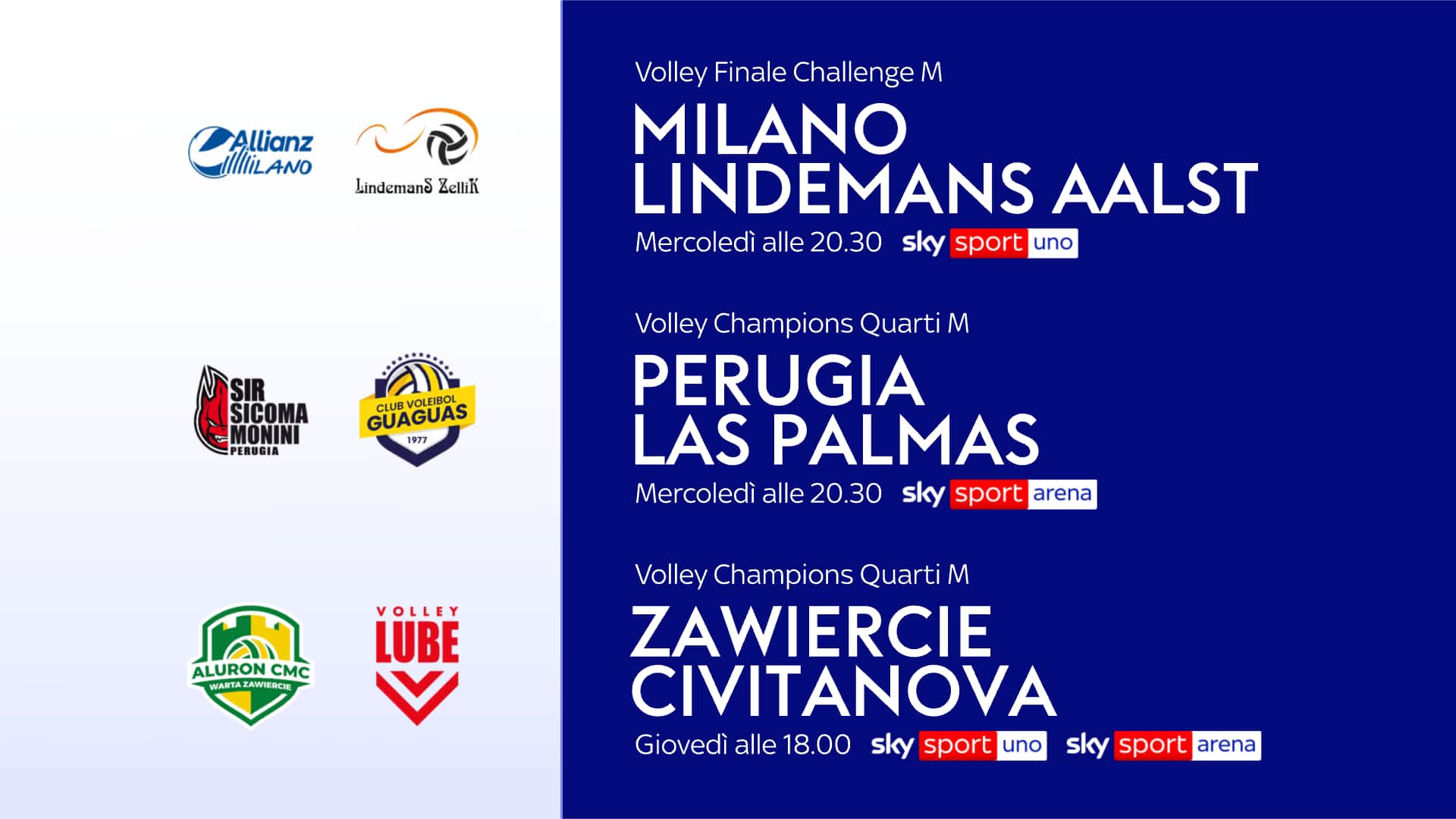 - Alle 18: ALURON CMC ZAWIERCIE-LUBE CIVITANOVA, Sky Sport Uno e Sky Sport Arena. Telecronaca di Stefano Locatelli e commento di Andrea Zorzi