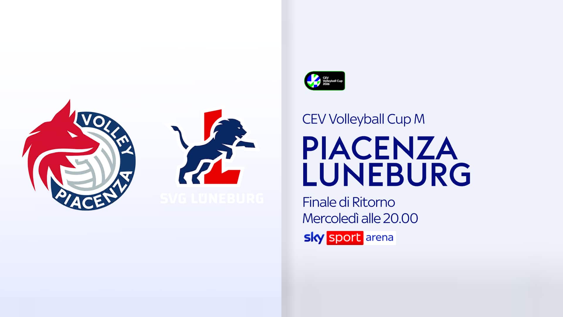- Alle 20: GAS SALES BLUENERGY PIACENZA-SVG LUNENBURG- (Finale di ritorno Cev Cup maschile) su Sky Sport Arena. Telecronaca di Stefano Locatelli con il commento di Andrea Zorzi
